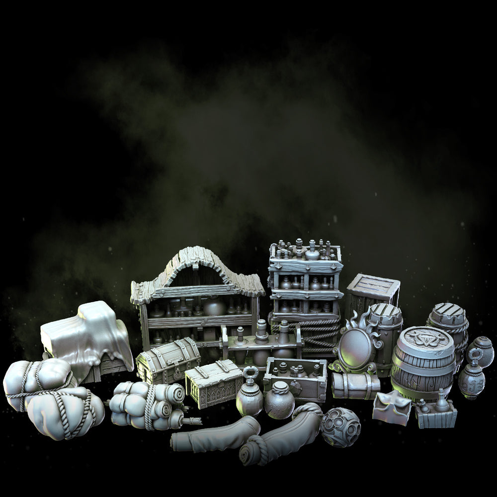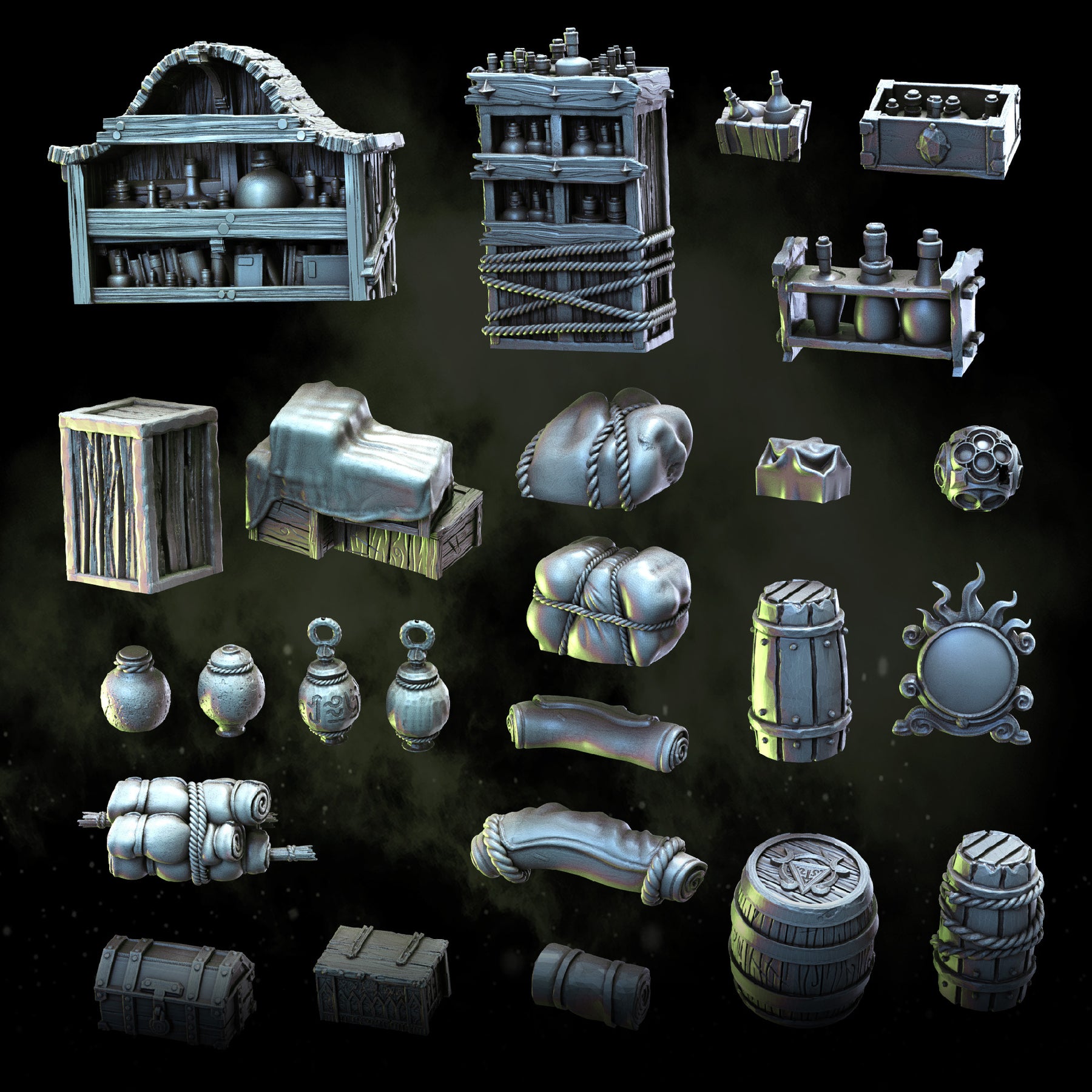 A collection of alchemic scrolls, reagents and doodads. Valuable tools for the Alchemic Order's strange science.