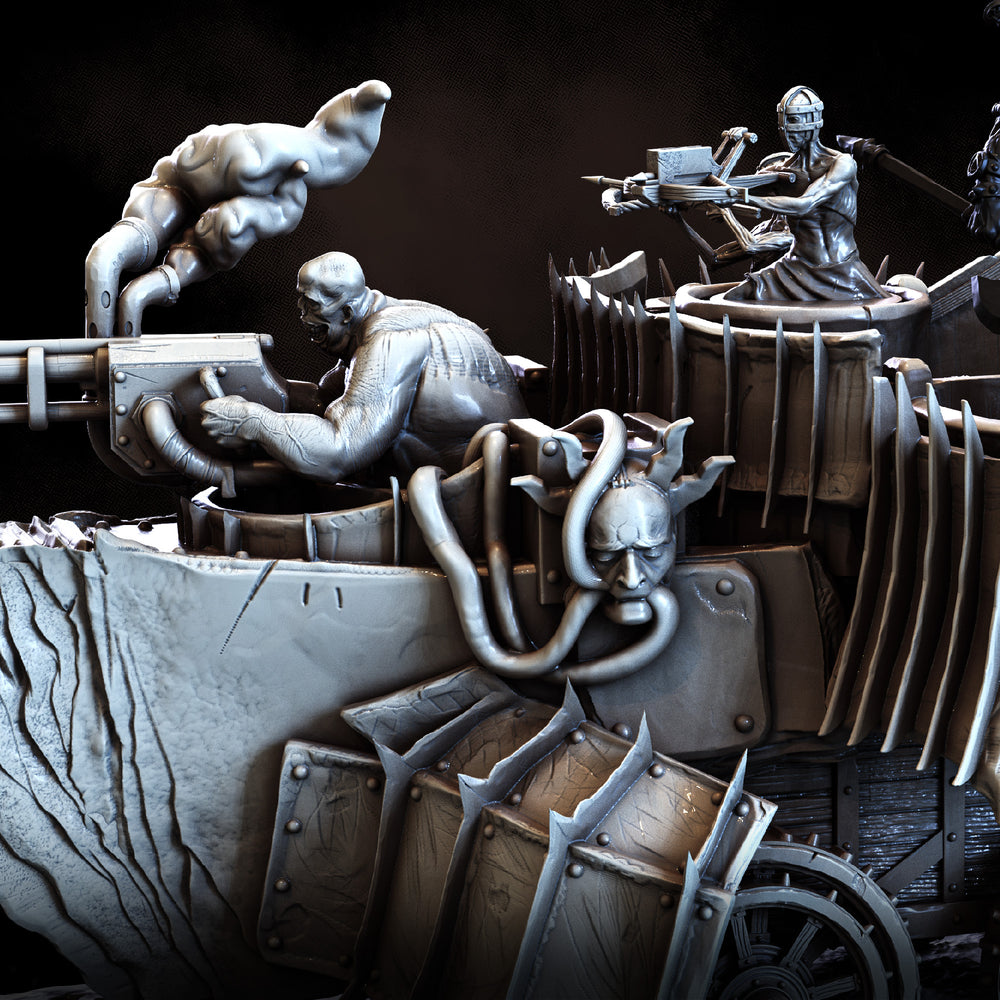 A faceless fortress of iron and silence, driven by husks and buried engines. Contains one Armoured Transport Wagon on a 160x90mm base.