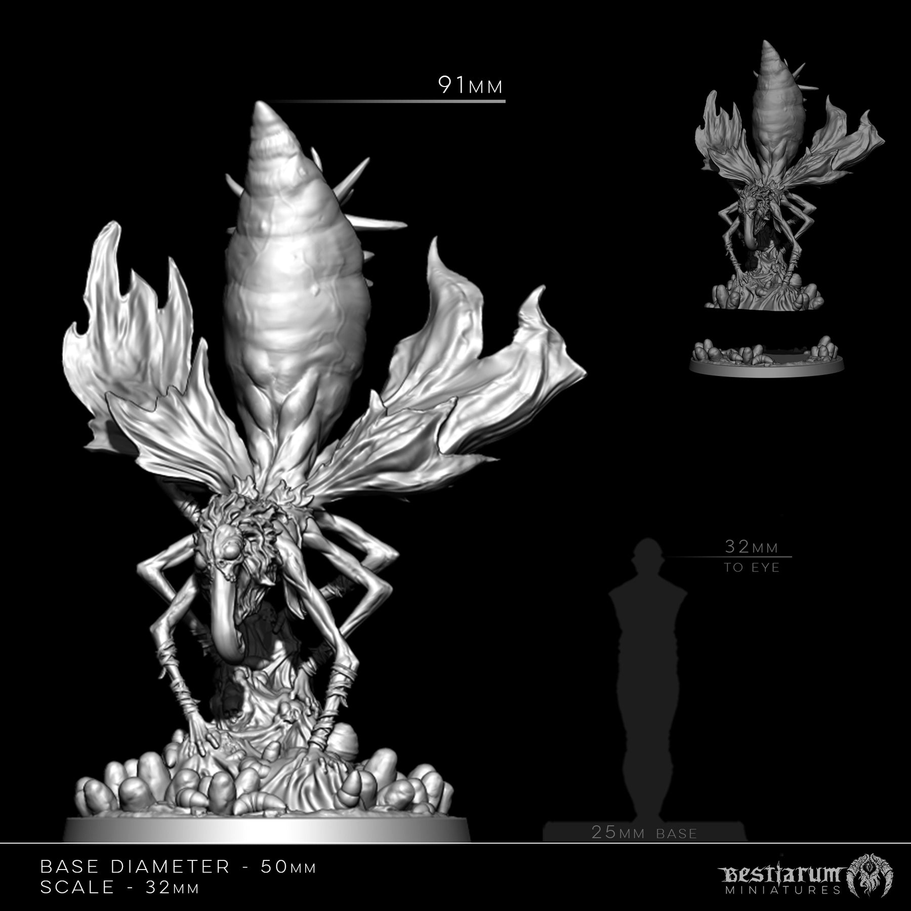 Vast wings shed glowing dust while a fanged abdomen crashes down on trespassers.