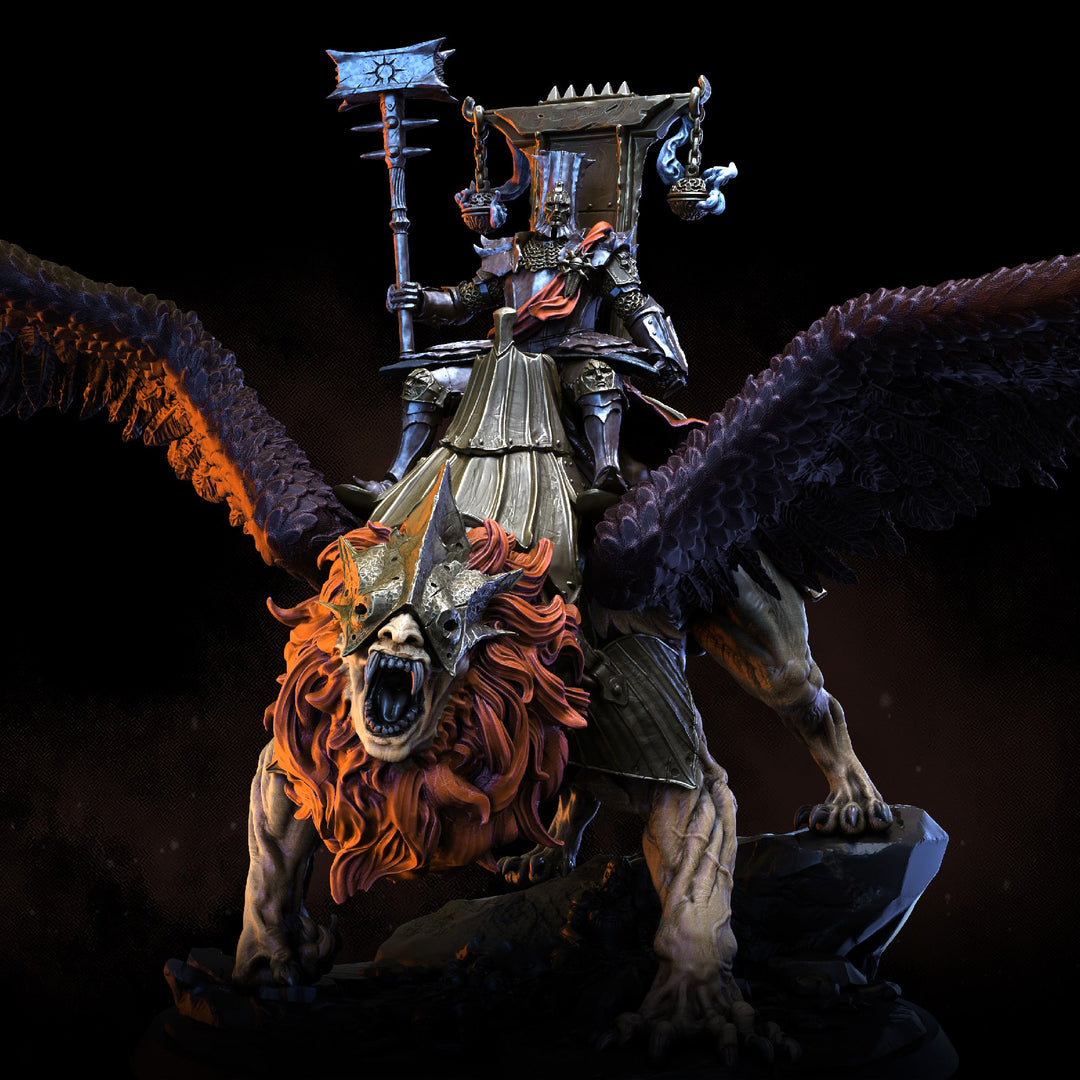 A soaring symbol of divine wrath, mounted on a winged Manticore, this battle-lord leads with devastating fury. Contains one Commander-Primus on Manticore on a 100mm base.