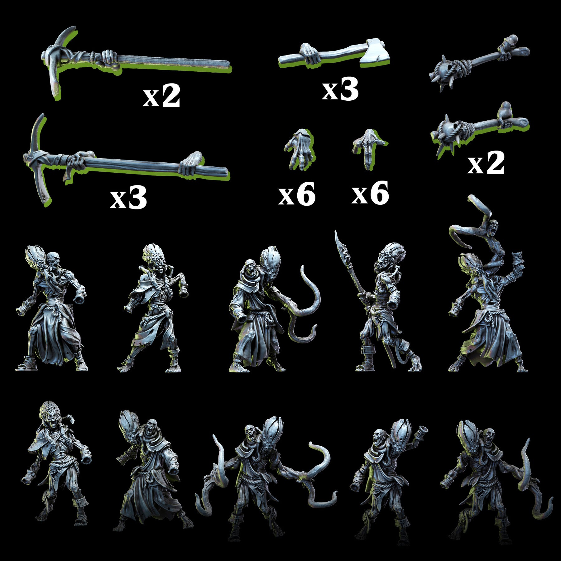 Shuffling shells of faith, endlessly repeating broken rituals as the brood’s pawns. These gruesome thralls are customisable - including a choice of weapon loadouts, and are cross-compatible with our Penitent Crusade & Trench Invasion ranges.