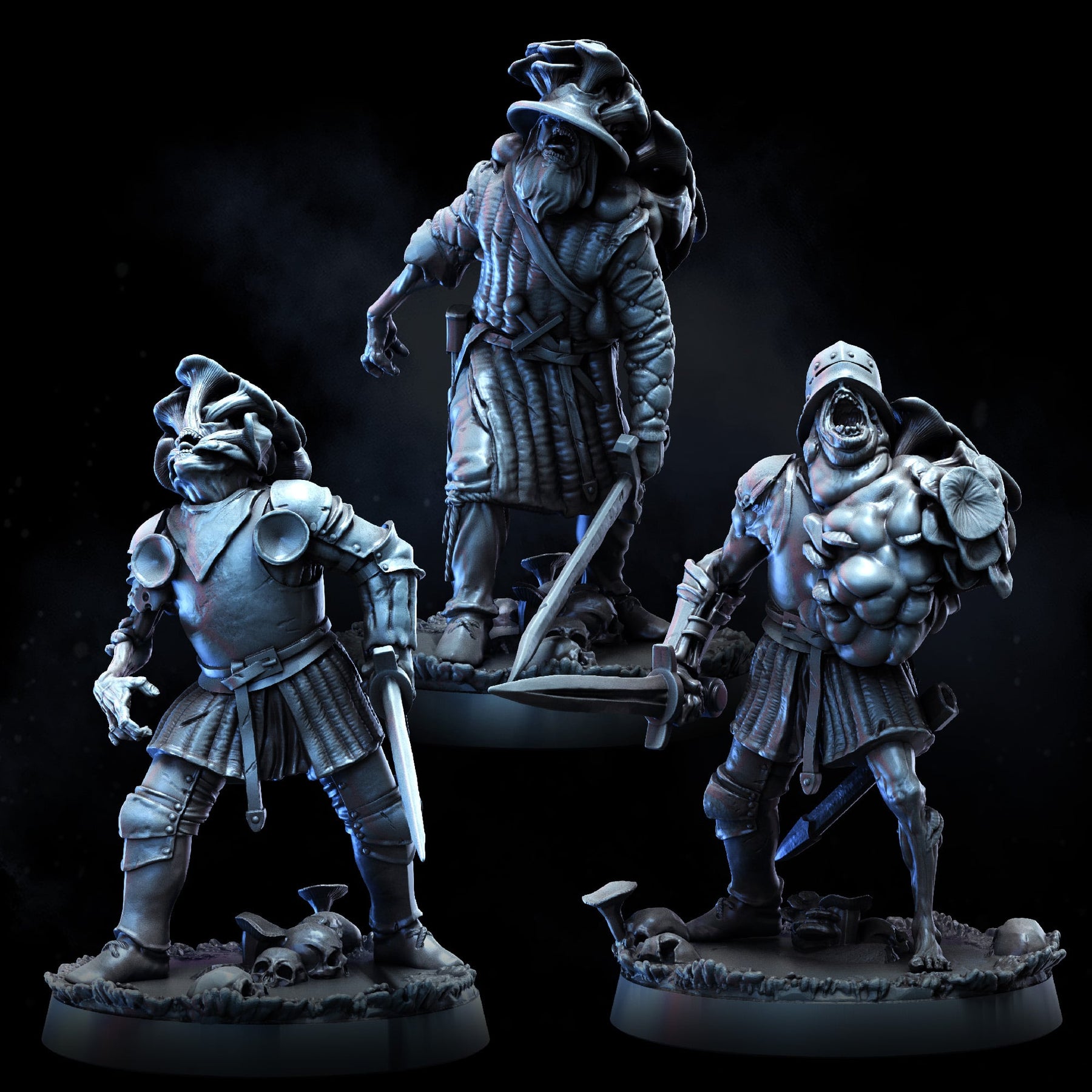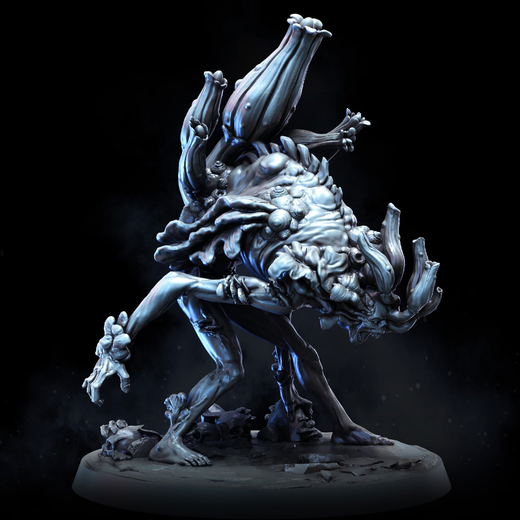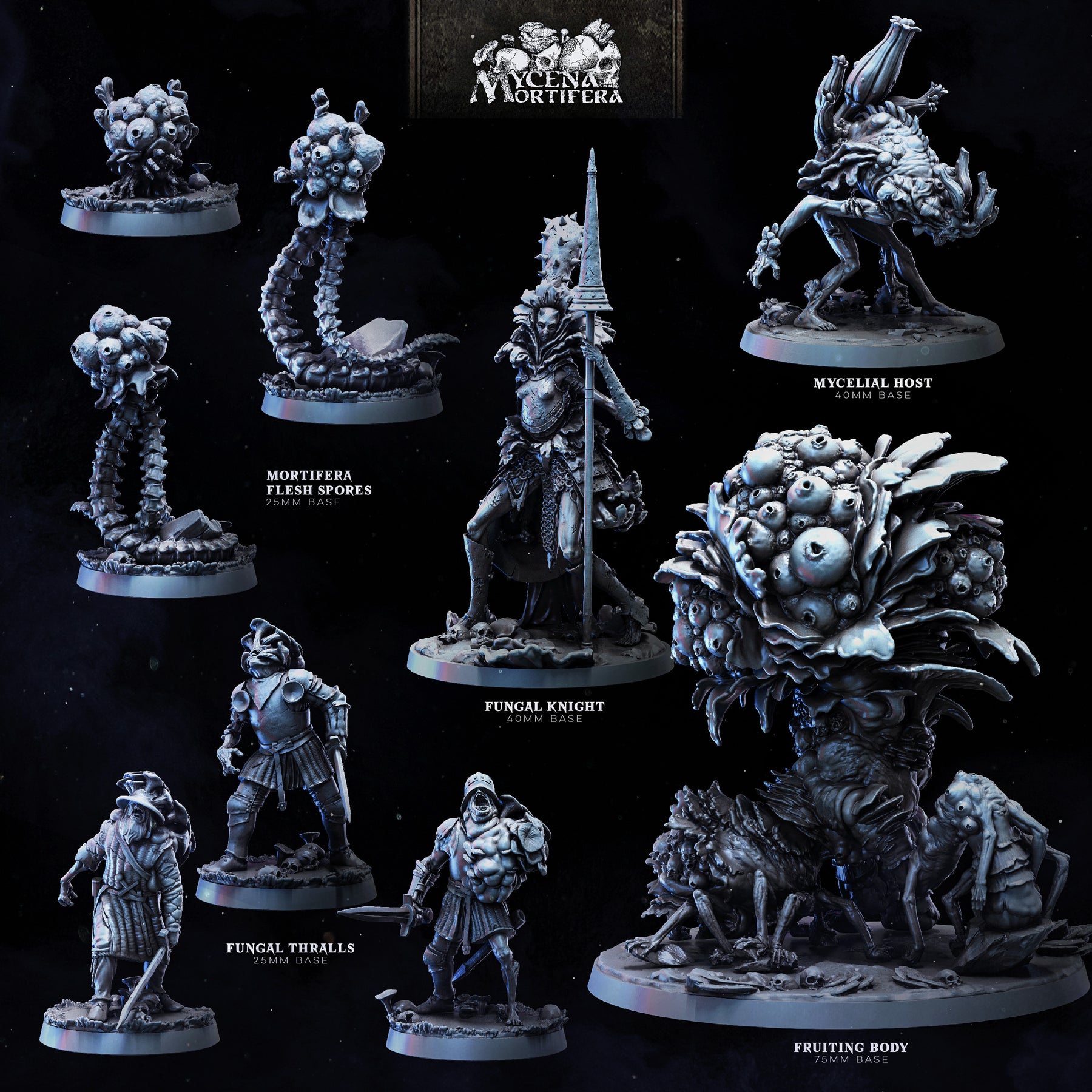 Mycena Mortifera is a malevolent fungal entity, a vast gestalt intellect formed from mycelial networks deep beneath the earth. It extends its reach through fruiting bodies that release spores across the surface, infecting any creature that inhales them. Those who fall victim become decaying thralls, their minds and bodies controlled by the relentless fungal intellect, growing its ever-expanding army.