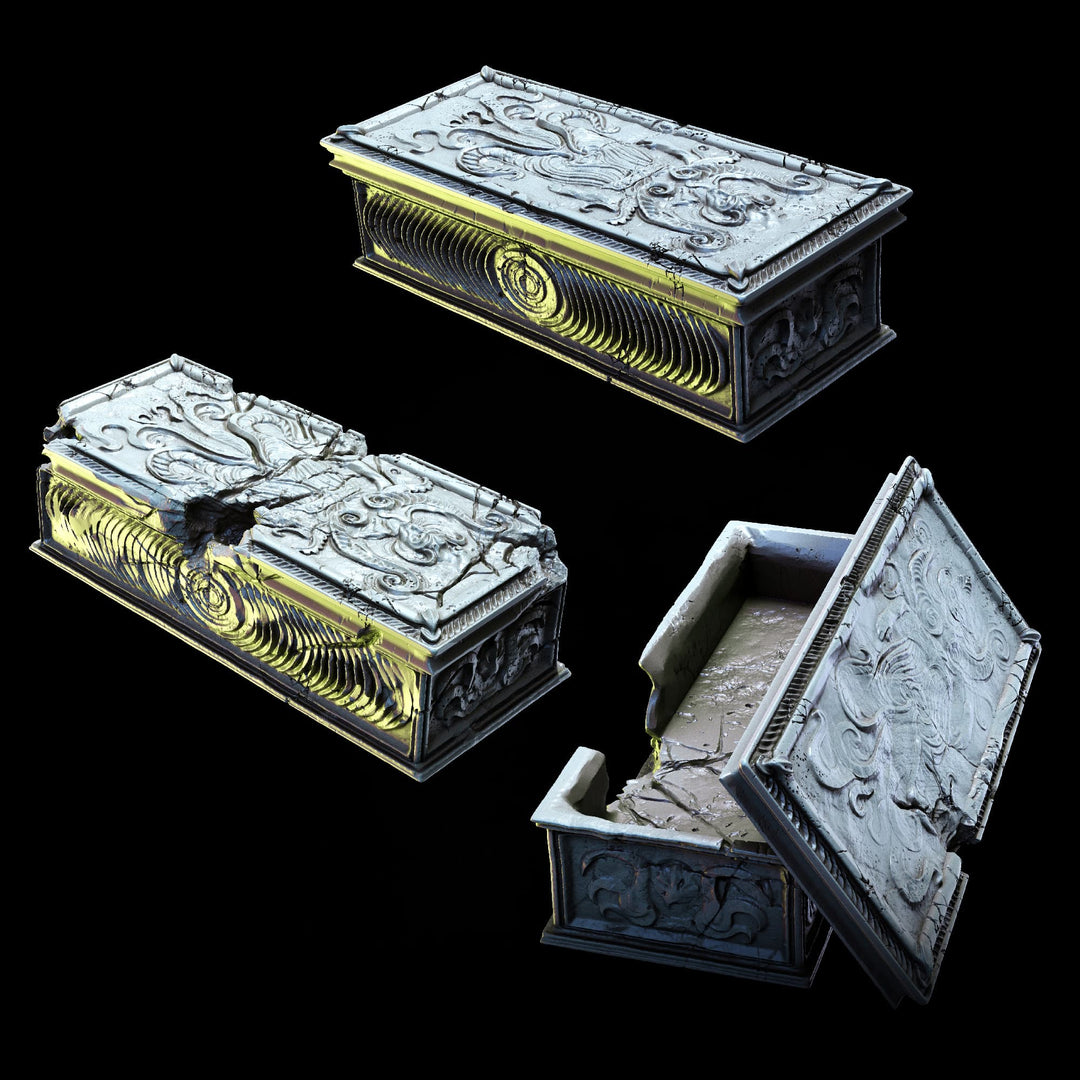 Relics of ritual death, these sealed stone sarcophagi hold desiccated faithful untouched by time, now stirring with divine unrest.
