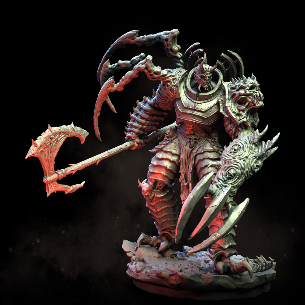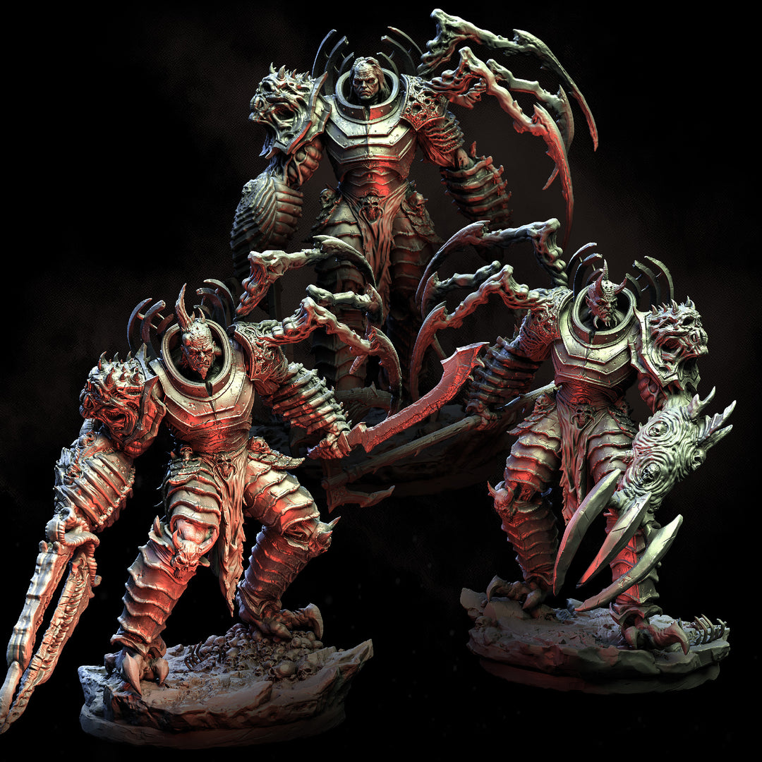 Three Raiders, bulky warriors of the Skragoth Tribes, covered in cruelly barbed platemail.
