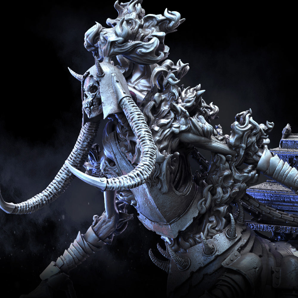 Wreathed in ghostfire, this hulking abomination marches solemnly onward, its six armored legs carrying the weight of a regal sarcophagus upon its back. Within the ornate casket lies the remains of the Queen of Sorrows, a chilling testament to her undying torment.