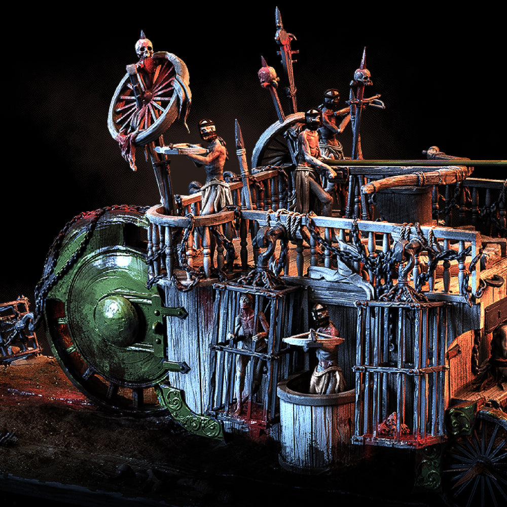 A galloping siege engine of relentless precision, drawn by four shire horses and engineered for holy war.