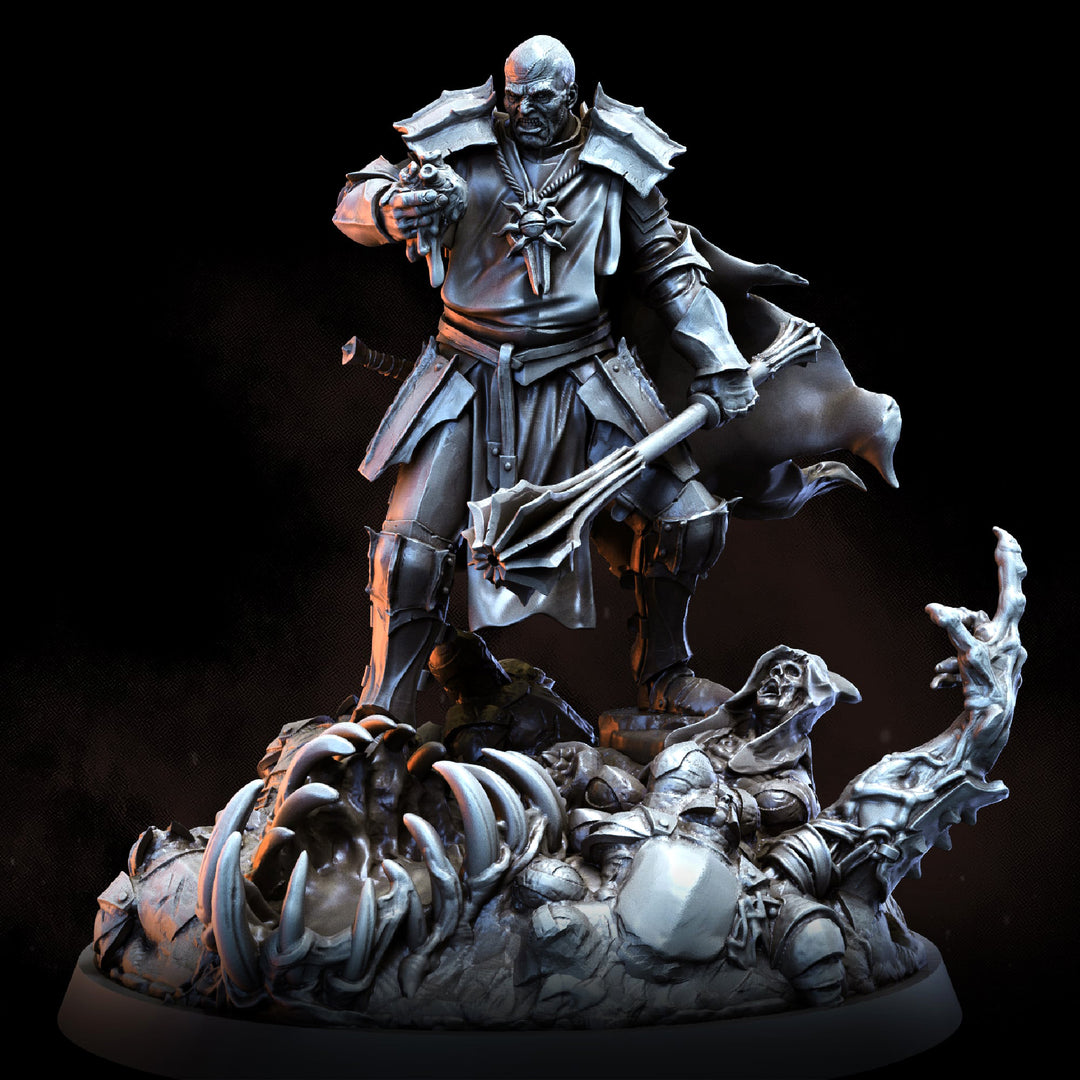 A Bulwark stands atop a mound of corpses, bloodied and unhelmed, devouring the heart of a fallen foe. Contains one Unwelcome Salvation diorama on a 50mm base.