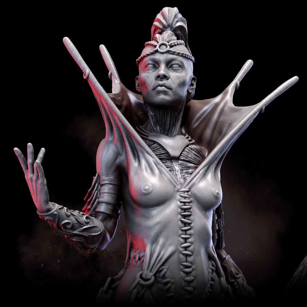 Once a sister of the Church of Azerai, Vyxra discovered a tome of ancient necromancy while researching in the restricted vaults of her monastery.She fell into darkness, seduced by the knowledge that lies inherent to the human soul, the forbidden wisdoms that bind us to the world beyond.