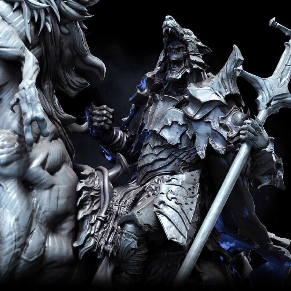 A revenant warlord atop a monstrous steed, the Wolf of Calden rides once more, clad in cruel steel and bound by vengeance. Contains one Wolf of Calden on Accursed Destrier on a 65mm base.